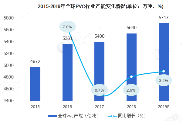 根據(jù)IHS數(shù)據(jù),2018年全球PVC生產(chǎn)能力為5540萬(wàn)噸,而在2019年,全球PVC生產(chǎn)能力約為5717萬(wàn)噸。