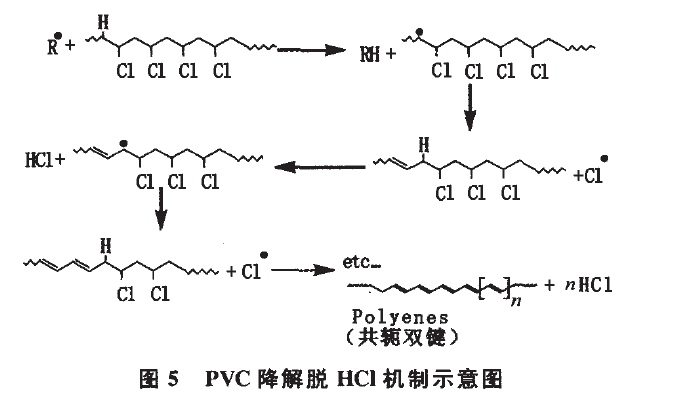 PVC樹脂降解脫HC1是型材變色的主要內(nèi)部因素,其降解機制示意圖見圖5。
