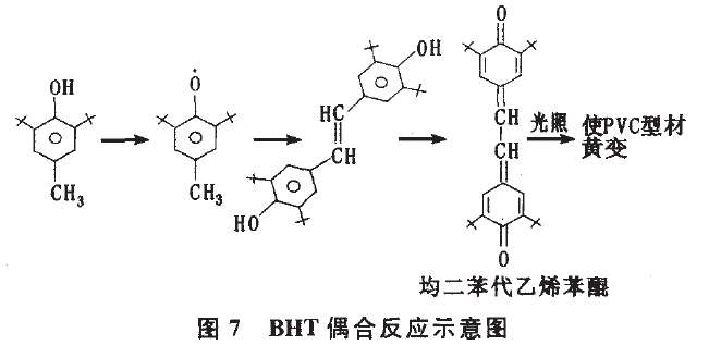 目前。PVC型材生產(chǎn)廠家使用的穩(wěn)定劑以復合穩(wěn)定劑為主,除了對PVC降解起穩(wěn)定作用的主體化合物。還包含潤滑體系、抗氧體系等助穩(wěn)定體系。其中的抗氧體系可能包括酚類穩(wěn)定劑和亞磷酸酯類助穩(wěn)定劑。這些化合物可能含有易變色的有機雜質(zhì),另外它們自身有可能在光、氧、水的作用下發(fā)生變色反應(yīng)。有資料報道指出,某些亞磷酸酯類產(chǎn)品可能含有顏色污染性成分。常用的亞磷酸酯類產(chǎn)品有亞磷酸酯三苯酯(TPP)和亞磷酸一苯二異辛醇(PDLOP),其中TPP由苯酚和三氧化磷反應(yīng)制得。苯酚是一種化學性質(zhì)不穩(wěn)定的物質(zhì),它在光照下會發(fā)生互變異構(gòu)反應(yīng),呈紅褐色。如果TPP生產(chǎn)過程控制不嚴,會造成產(chǎn)品羥基值過大,即殘留較多的苯酚單體,這樣的產(chǎn)品就可能導致型材在室外貯存或應(yīng)用時發(fā)生變色現(xiàn)象。即使TPP無殘留苯酚單體,因其水解穩(wěn)定性差,在潮濕、光照和受熱條件下會水解生成苯酚單體,也使型材變色。某些低空間位阻效應(yīng)的酚類抗氧劑(如BHT),可能在紫外線照射、一定的濕度和氧的條件下發(fā)生偶合反應(yīng)(如圖7所示)。