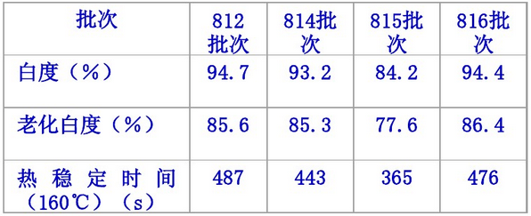 4個批次料的白度、老化白度及熱穩定時間的測試結果如表1所示。