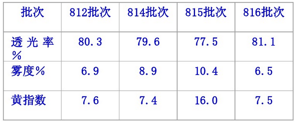 由表2可知:第815批次料的光學性能明顯比第812批次、第816批次差,尤其是黃色指數和霧度大大高于后者;而色澤稍差的第814批次料的霧度高于第812批次、第816批次,但低于第815批次。
