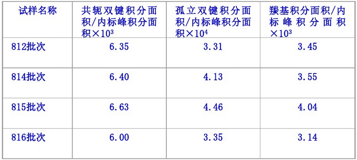 由表3可知:4個批次樣品的分子質量接近,分子質量分布基本一致,沒有明顯差異。由此可知,第815批次料色澤較差與分子質量及其分布無關。